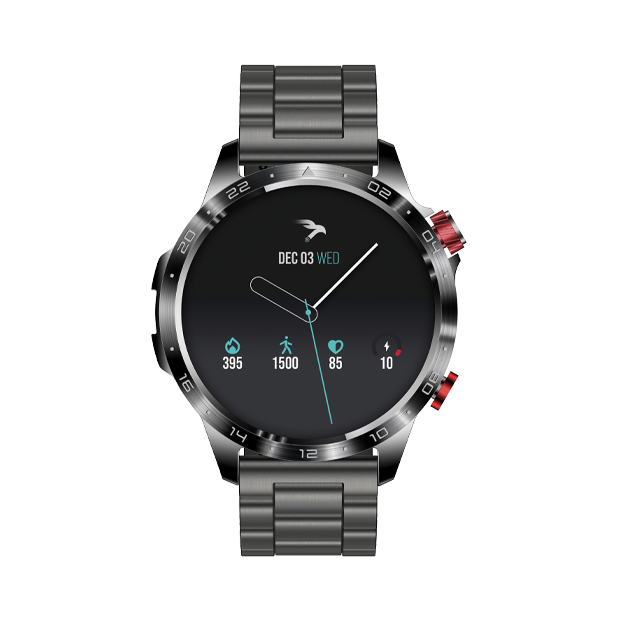 A large 1.43” full-colour AMOLED (Active Matrix Organic Light Emitting Diodes) touchscreen with a resolution of 466 x 466 pixels.